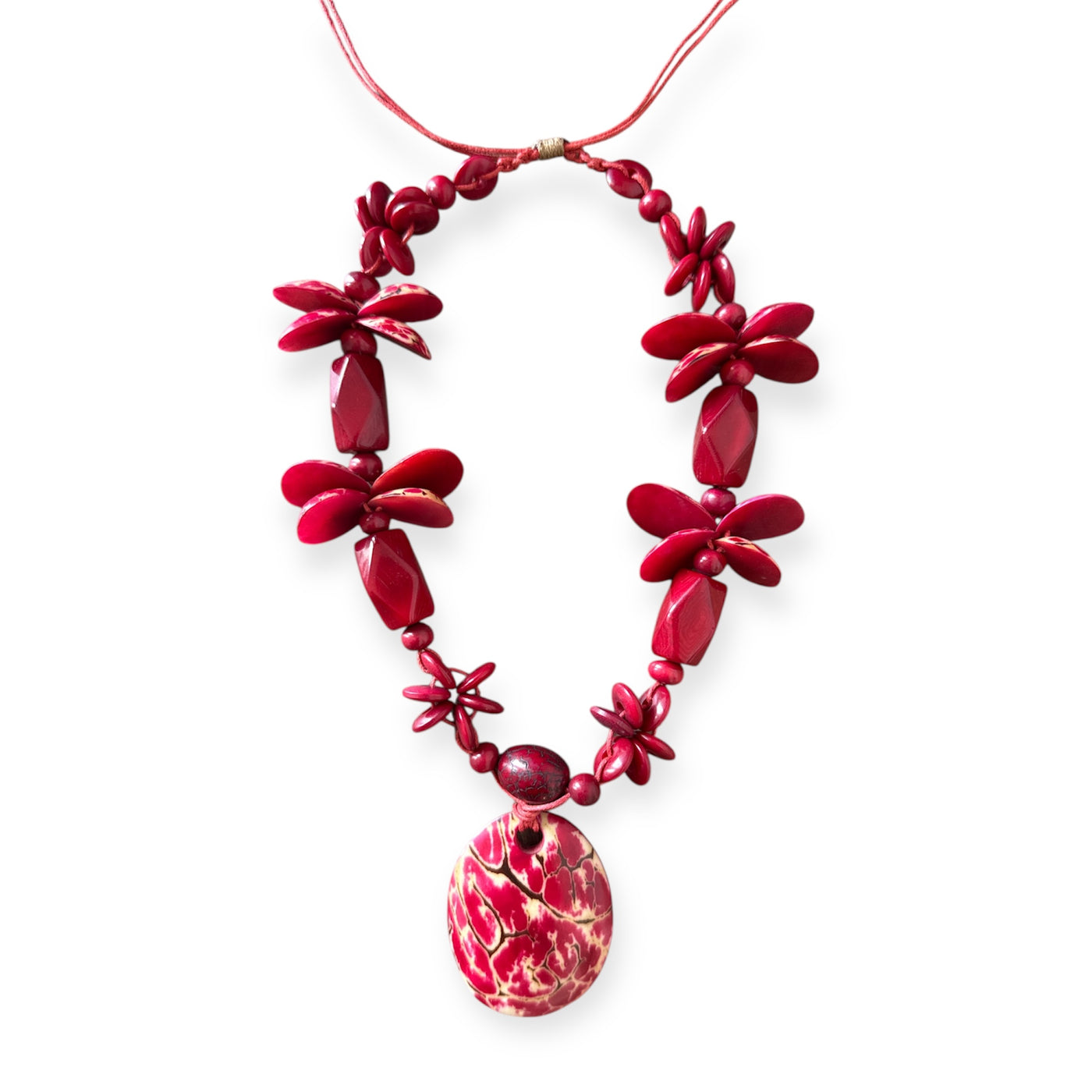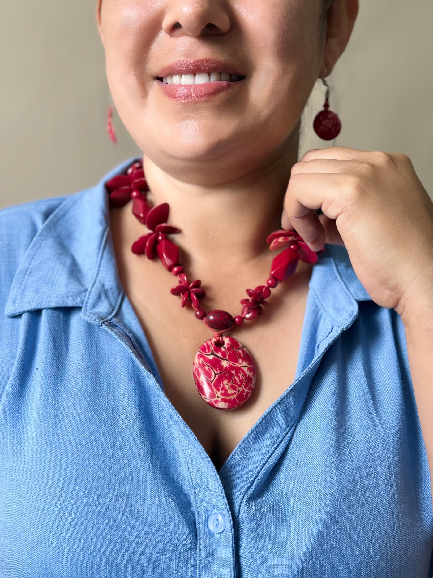 El collar Coral Andino es una pieza artesanal elaborada con tagua natural, trabajada a mano para resaltar su color vibrante y su textura orgánica. Su diseño combina formas talladas con un colgante redondo de gran presencia, creando un accesorio único que aporta carácter y elegancia a cualquier look. Incluye aretes