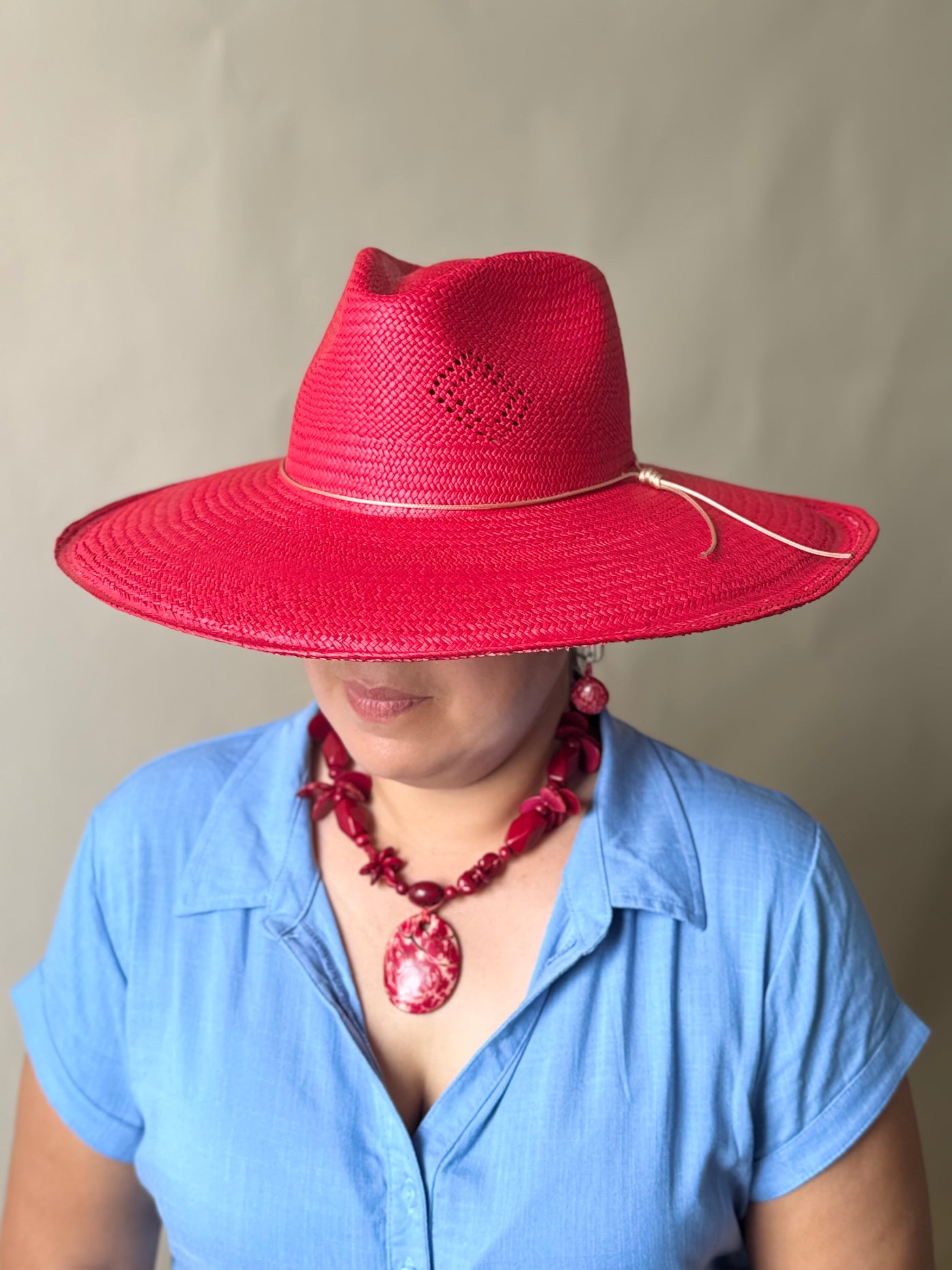 El sombrero Fuego a Toquilla es una obra artesanal donde la tradición ecuatoriana se enciende en un rojo vibrante lleno de energía. Tejido completamente a mano en auténtica paja toquilla, su color intenso y su ala amplia lo convierten en una pieza que cautiva miradas y eleva cualquier outfit con carácter y distinción.