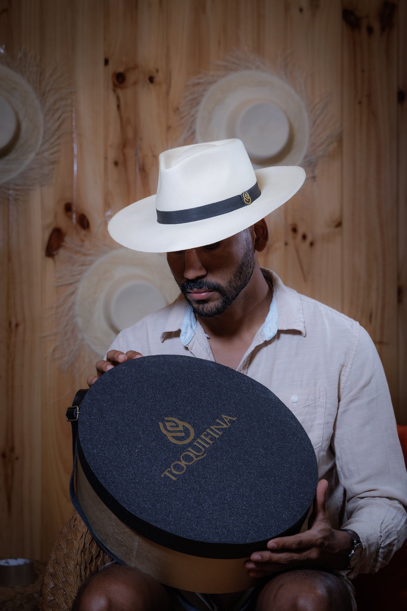 Complementa tu experiencia TOQUIFINA con nuestra exclusiva caja hecha totalmente a mano. Diseñada para proteger y resaltar la belleza de tu sombrero fino.